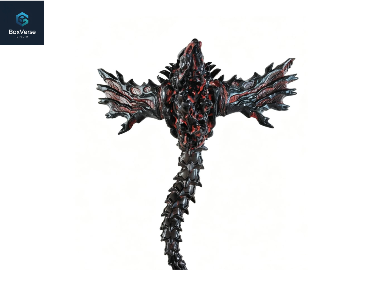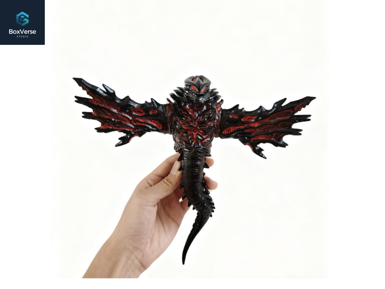Wings: When unfolded, the membrane wings span up to 80 meters. The wing edges are serrated with spikes, and the crimson vein patterns serve as energy conduits. When it beats its wings, it can generate localized hurricanes — even tearing rifts in space to create small wormholes.